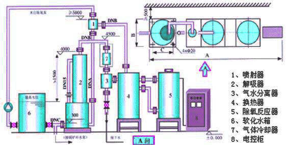 12、解析除氧器應與水箱在同一水平面上,特殊情況應提前說明,設備在安裝布置時,應保證布置主要尺寸中A值和C值的要求,考慮B值時應當盡量使設備安裝緊湊。